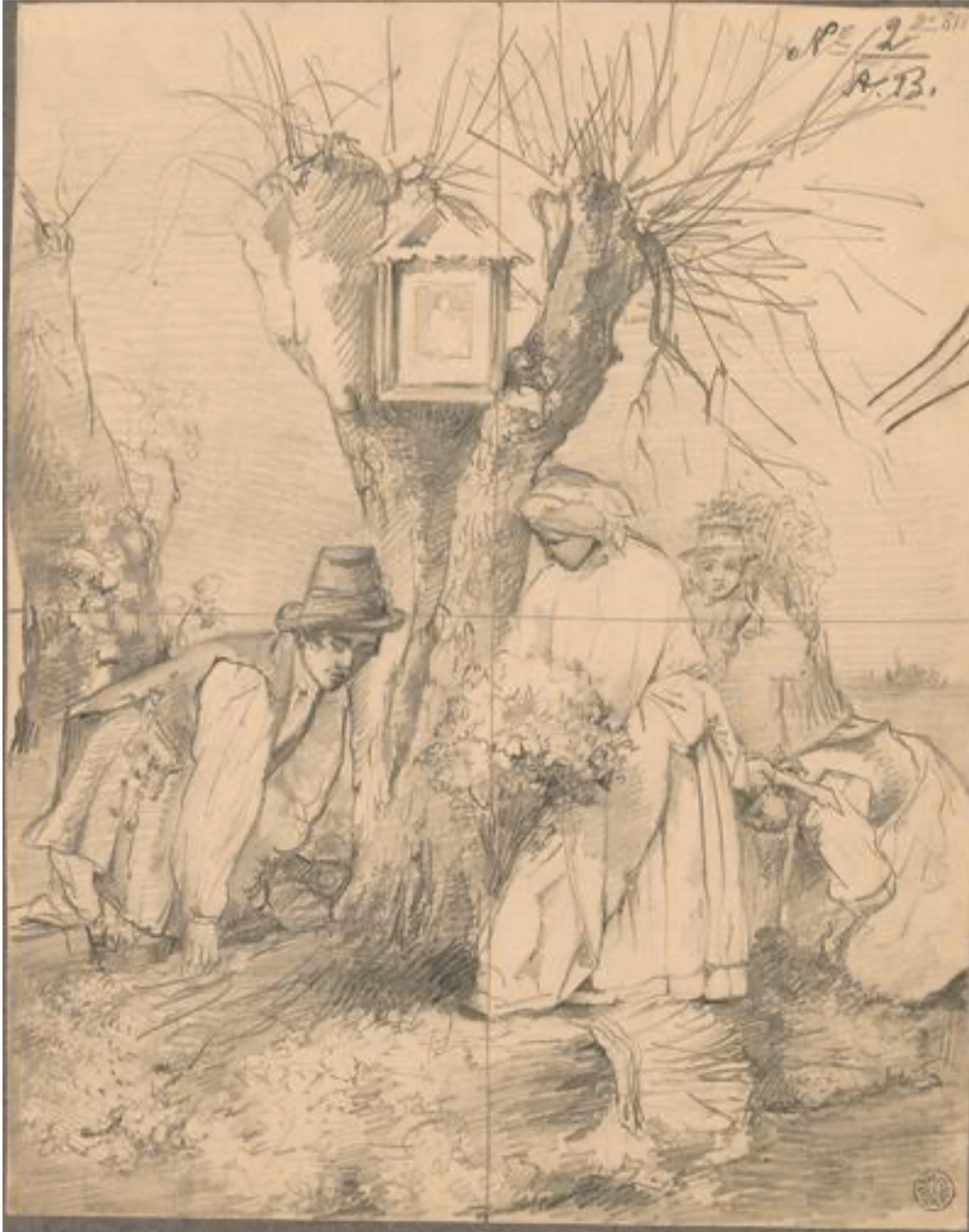 Żniwa w Krakowskim. Wiązanie snopków; verso: program wieczoru teatralno-muzycznego u pp. Michałowstwa Łappów z udziałem Anny Bilińskiej i jej brata Władysława autorstwa Bilińska-Bohdanowiczowa, Anna (1854-1893)